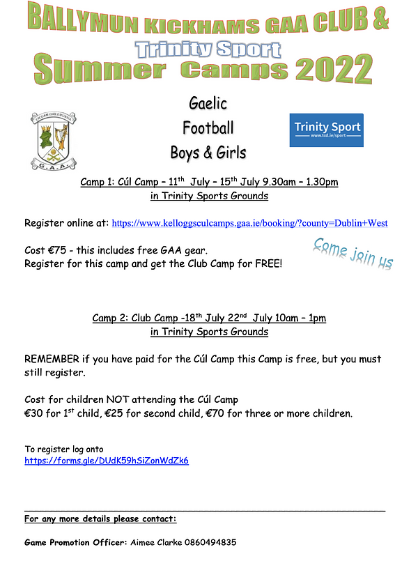 Register online here: https://www.kelloggsculcamps.gaa.ie/booking/?county=Dublin+West
